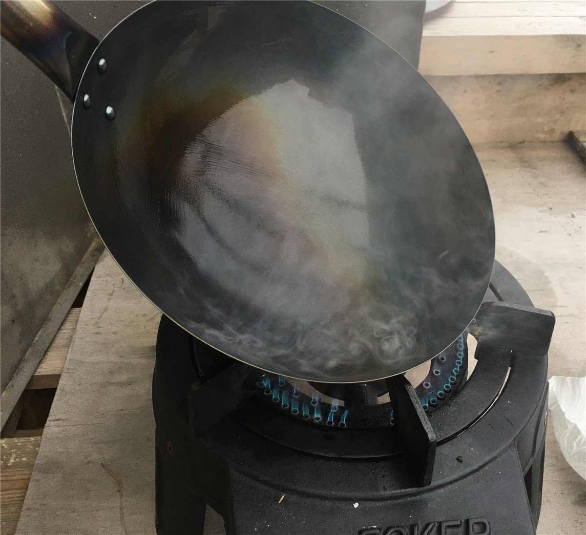Wok Pfanne 40 cm Ø Eingebrannt rund Boden Carbon Stahl Holzgriff Gas Herd Grill